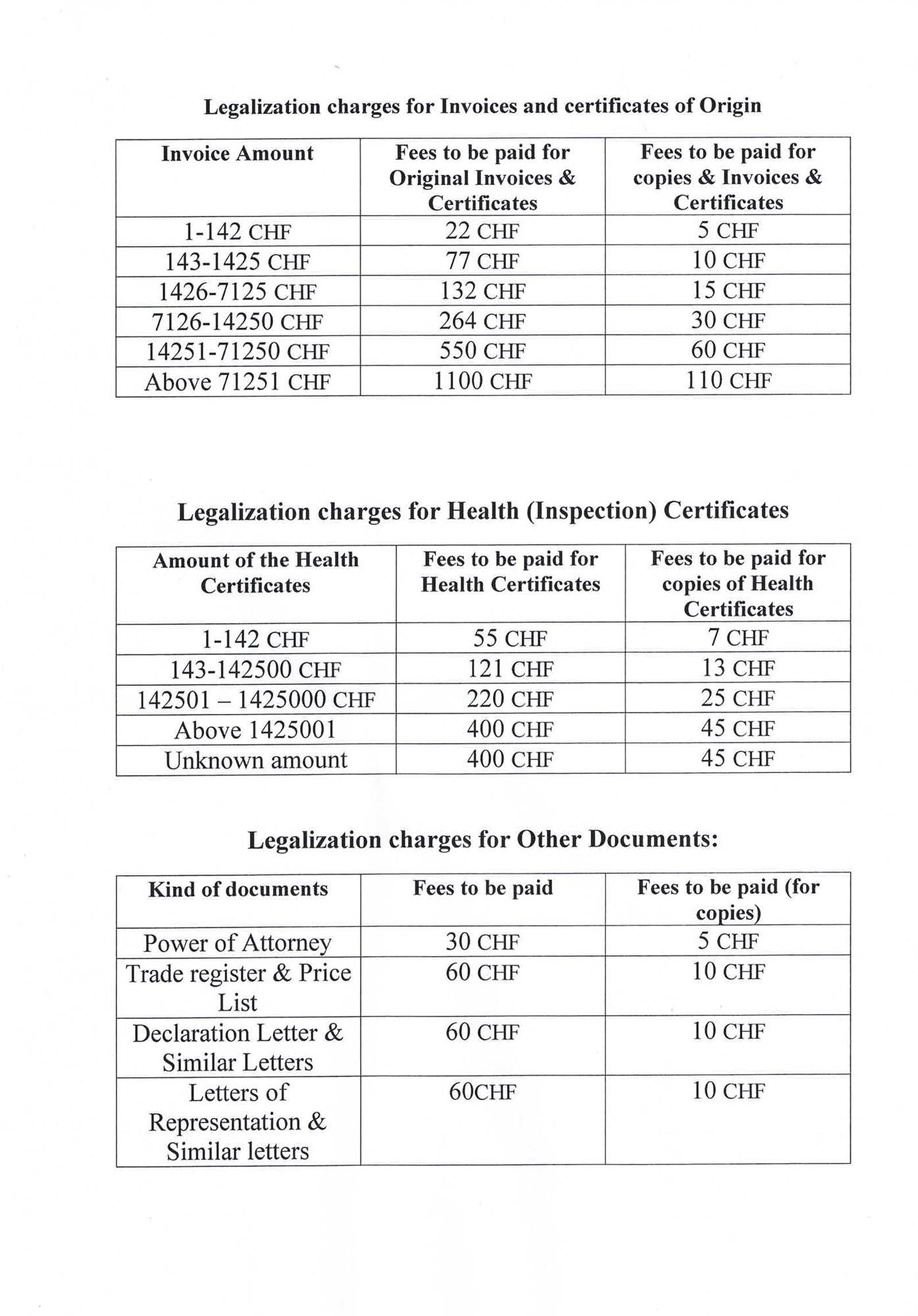 In case the invoice lacks the total cost of goods, or the request for Legalization of certificate of origin and Health certificate lacks the bill/invoice, according to the regulations, the maximum fee listed in the tariffs of the consulate will be demanded from the applicant of the legalization process.