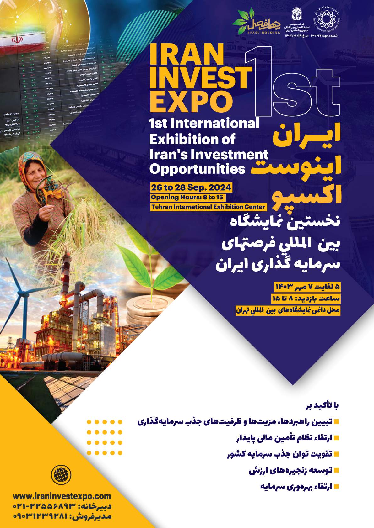 نخستین نمایشگاه بینالمللی فرصتهای سرمایهگذاری ایران به عنوان یک نمایشگاه، تخصصی و گسترده با رویکرد جذب سرمایه در عرصههای مختلف صنعتی، فرهنگی، اجتماعی، بهداشت و سلامت، علم و فناوری، گردشگری و در گستره جغرافیایی منطقه ای، استانی، ملی و بین الملی با تمرکز بر جذب سرمایه برای استارتاپ ها، ایدههای مبتنی بر حل مسئله، پروژههای کلید خورده، طرح و برنامههای ارزش آفرین و توسعه عملیاتی کلان پروژهها و همچنین ارائه خدمات مشاوره، آموزش، منتورینگ و هدایت در زمینه سرمایه گذاری و سرمایه پذیری از طریق برپایی غرفههای تخصصی، برگزاری رویدادهای عمومی و تخصصی، کارگاههای آموزشی، جلسات مذاکرات تجاری و ایجاد اتاق مذاکره تخصصی، با حضور کارشناسان اقتصادی، حقوقی و کارشناسان کسب و کار برای نخستین بار برگزار خواهد شد.