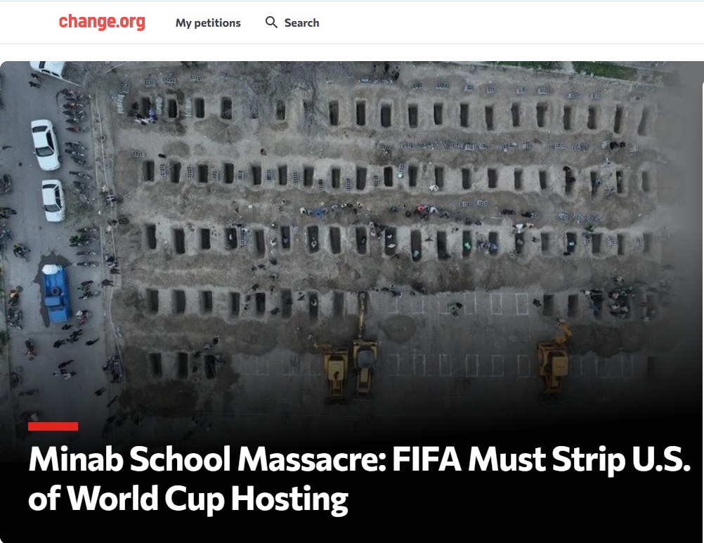 فیفا باید از تطهیر جنایات جنگی دست بردارد. فیفا باید خود را از ننگ حمایت از یک جنایتکار جنگی دور کند. دانش‌آموزان بی‌گناه مینابی که توسط ایالات متحده کشته شدند، سزاوار عدالت هستند. بسیاری از آنها عاشق فوتبال بودند و رویای تماشای جام جهانی و تشویق کشورشان را در سر می‌پروراندند.